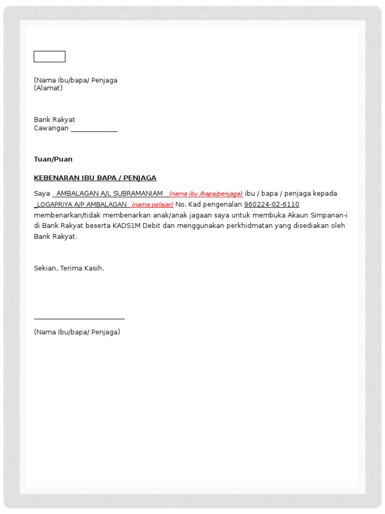 Contoh Surat Kebenaran Membuka Akaun Simpanan I Di Bank Rakyat Beserta Kads1m Debit Pdf
